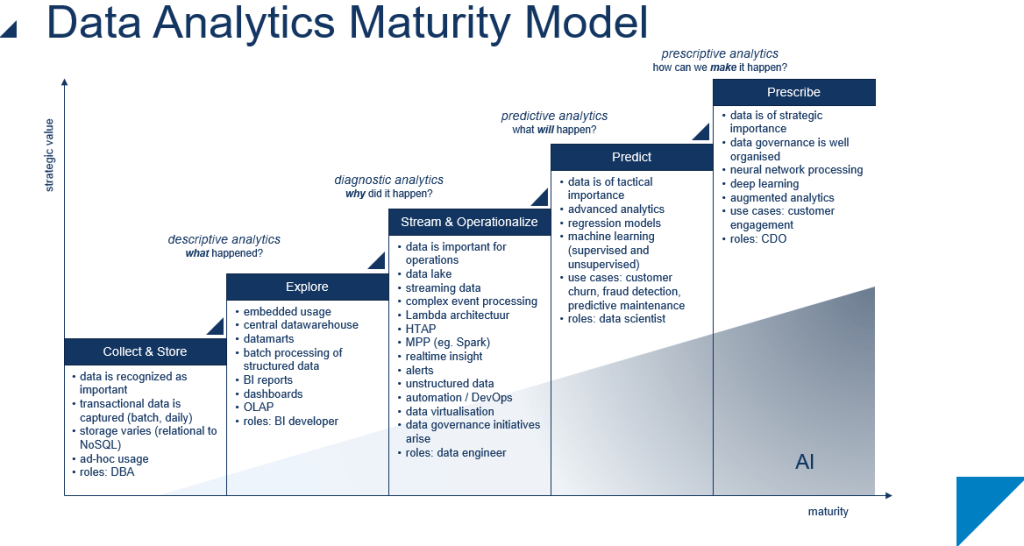 Berikut adalah gambaran level analisis Big Data yang diambil dari link berikut: https://blogs.infosupport.com/wp-content/uploads/2019/11/Data-Analytics-Maturity-Model-InfoSupport.png. Kita dapat melihat bahwa level analisis ini telah mengawinkan profesi IT (Information Technology) dengan safety yang memunculkan fungsi BI developer, data engineer, data scientist, dan Chief Data Officer