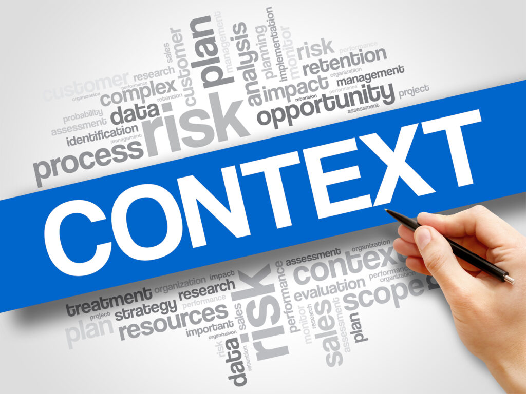 ISO 45001:2018 menggunakan istilah konteks organisasi dalam klausul 4 dimana organisasi wajib menentukan batasan faktor internal dan eksternal sebagaimana dijelaskan diatas. Setelah batasan2 tersebut diidentifikasi baru kemudian dilanjutkan dengan proses penentuan dan pendokumentasian ruang lingkup Sistem Manajemen K3 yang digunakan. Konteks organisasi ini menjadi ini menjadi dasar dalam menentukan risiko dan peluang yang perlu dikelola (klausul 6) untuk memberikan jaminan bahwa Sistem Manajemen K3 dapat mencapai hasil yang diinginkan, mencegah/mengurangi efek yang tidak diinginkan, dan mencapai peningkatan berkelanjutan. Penentuan risiko dan peluang ini menggunakan lima kegiatan dalam proses manajemen risiko diatas.