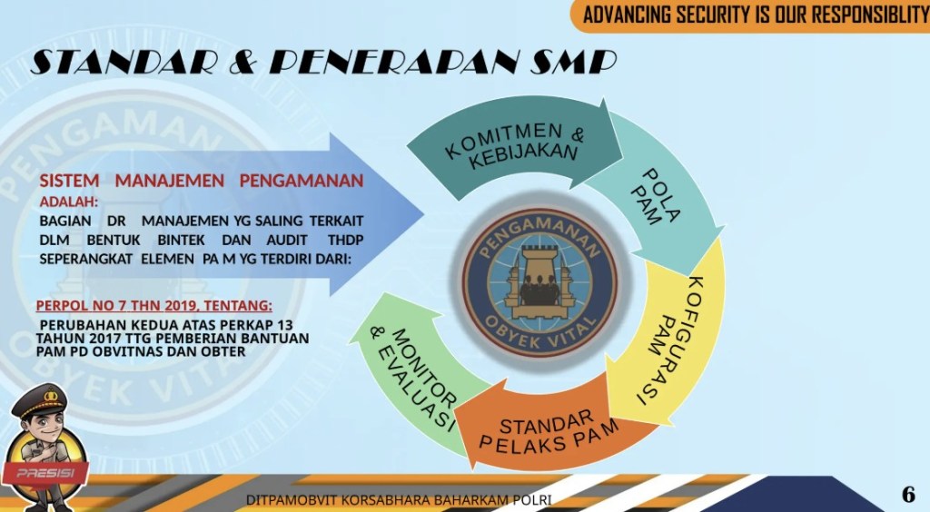 - Pasal 6, Standar dan penerapan SMP Obvitnas dan Objek Tertentu meliputi a) komitmen dan kebijakan, b) pola pengamanan, c) konfigurasi pengamanan, d) standar kemampuan pelaksanan pengamanan, dan e) monitoring dan evaluasi